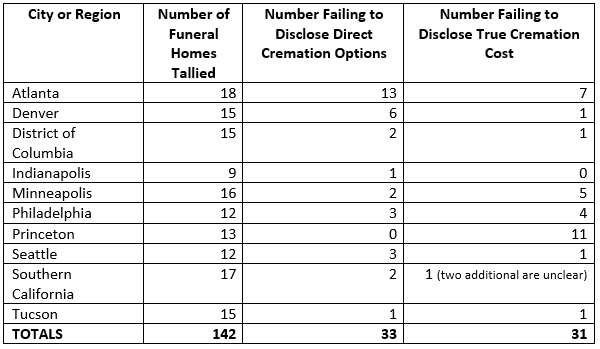 FCA and CFA analyzed 142 price lists from funeral homes in 10 metropolitan regions. Researchers looked for the FTC-required disclosures and prices for Direct Cremations: