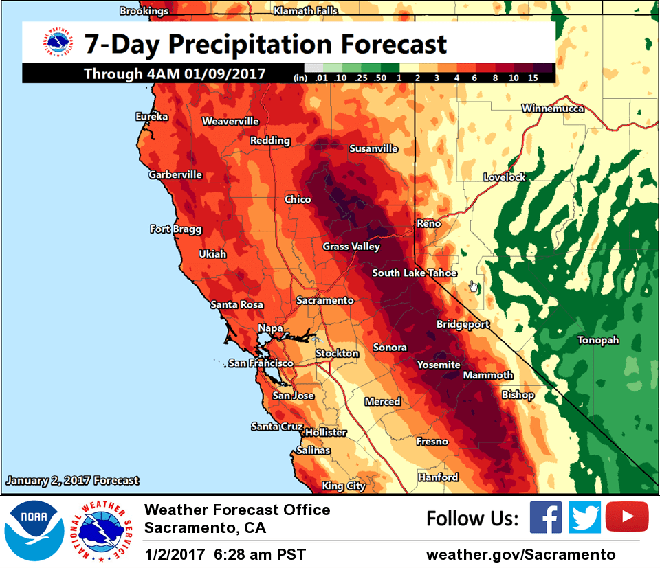 January 4, 2017 at 7:51 AM Mainly wet week ahead, dry on Friday, very heavy rain Sunday-Monday. A feed of subtropical moisture into northern California will keep a mainly wet pattern going over Norcal for the coming week. Todayโs system will bring snow over the Sierra through this evening with decreasing showers expected Thursday. Friday will see a break in the precipitation before another round of precipitation hits the north state over the weekend and into early next week. Sunday and Monday look to be the wettest days with high snow levels combining with heavy precipitation to bring another round of possible local flooding. Precipitation continues for the middle of next week but with lower snow levels.