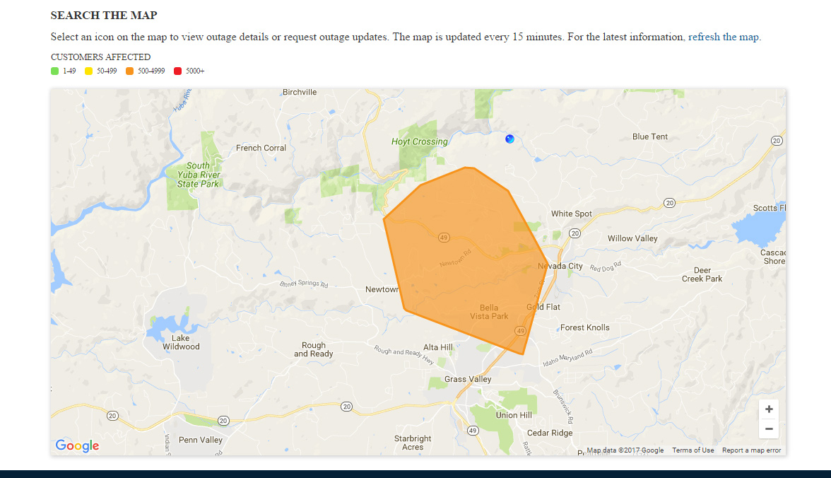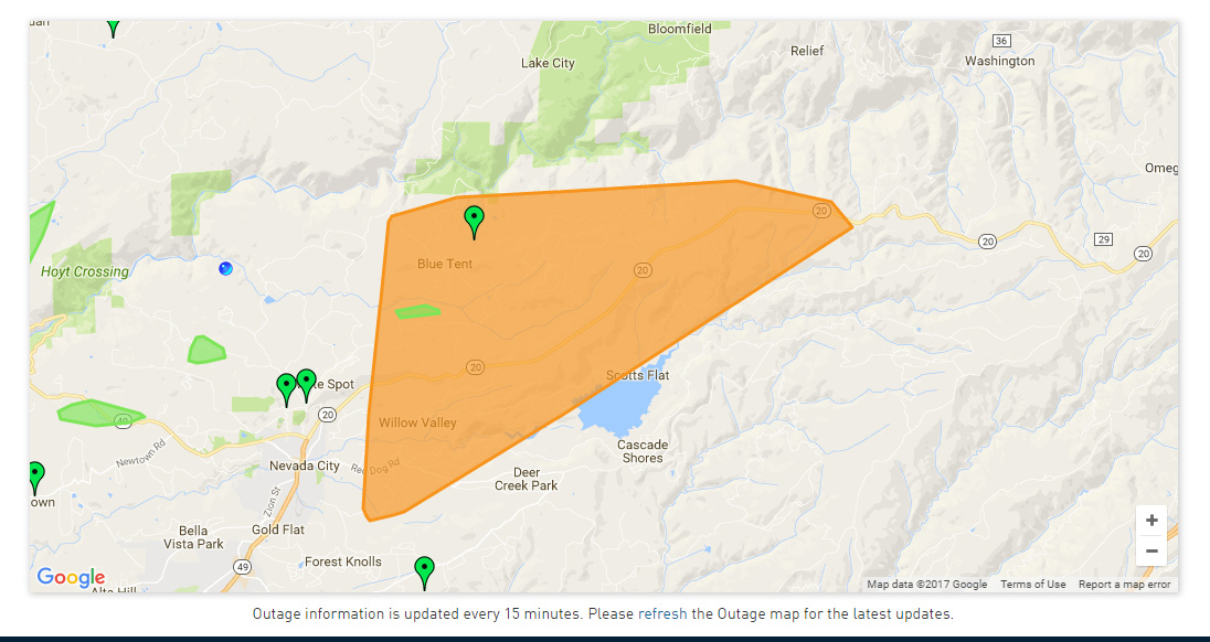 January 3, 2017 at 8:54 PM No estimated time of restoration available yet for a power outage affecting 650 homes in the Pasquale Road to Red Dog via Cascade Shores area of Nevada City. 215 customers remain without power from Cooper Road to White Cloud on Hwy 20. North Columbia, Camptonville, Downieville also remain without power. Forbestown, Frenchtown, portions of Challenge and Brownsville up to Laporte are expected to have power restored by 10 pm tonight.