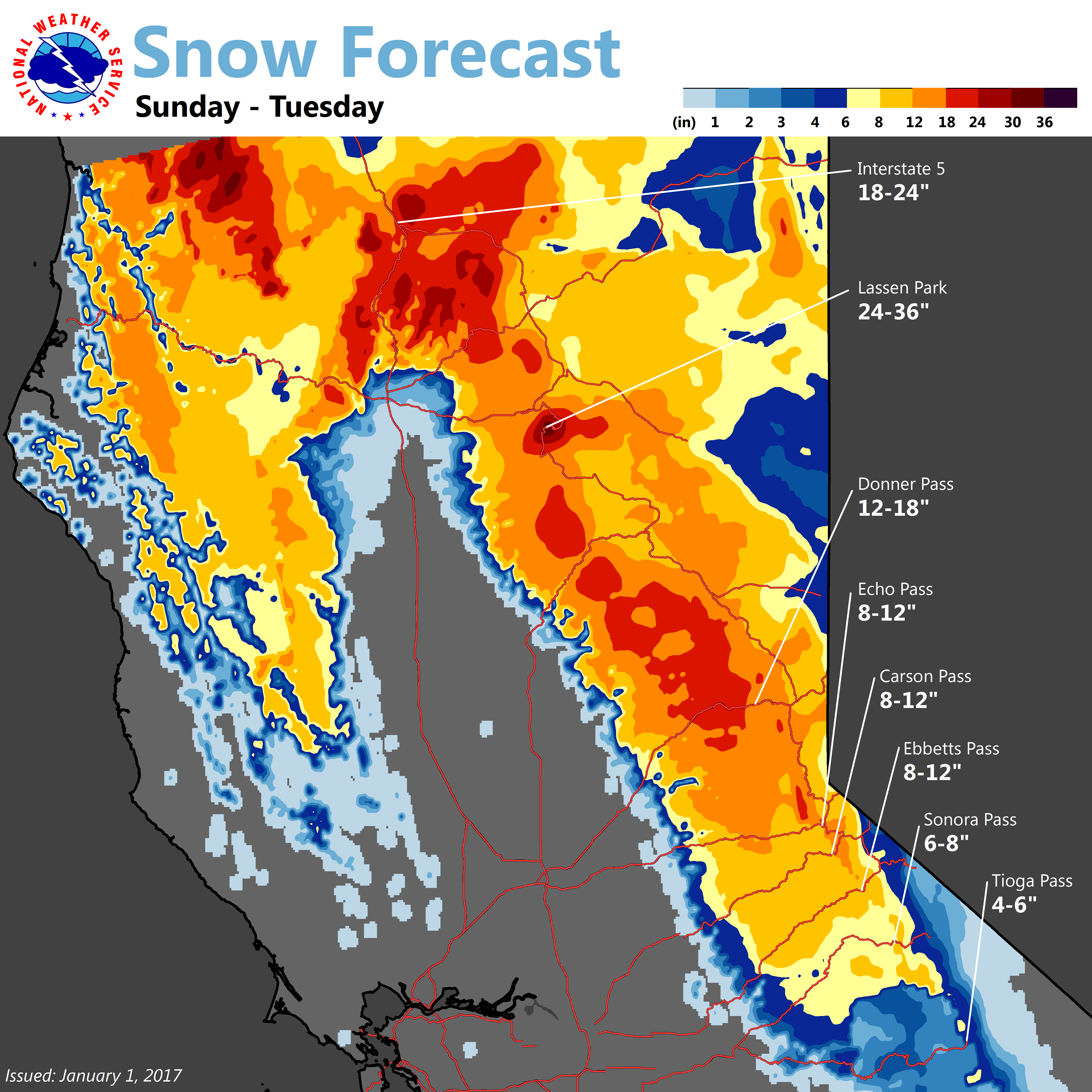January 1, 2017 at 8:38 PM Happy New Year from the crew at NWS Sacramento. For this first day of 2017, we bring you a forecast of colder weather with rain and snow today through Tuesday followed by more wet weather in the latter half of the week.
