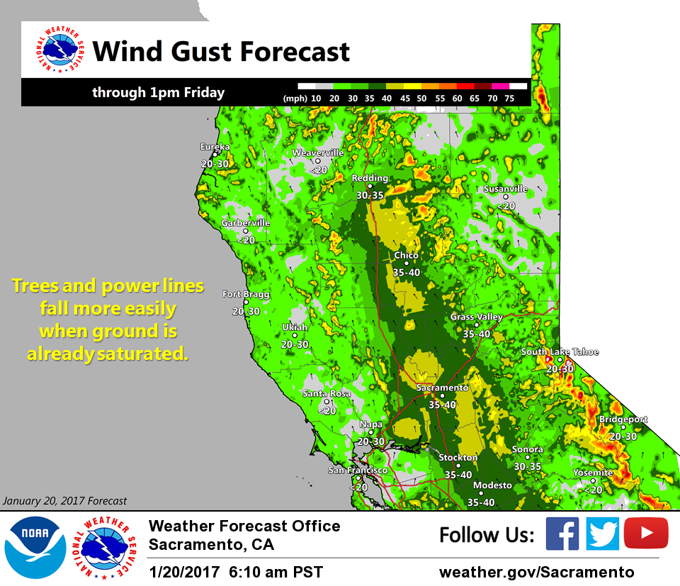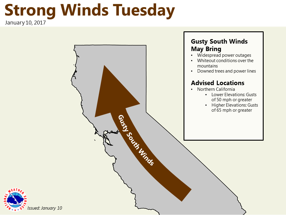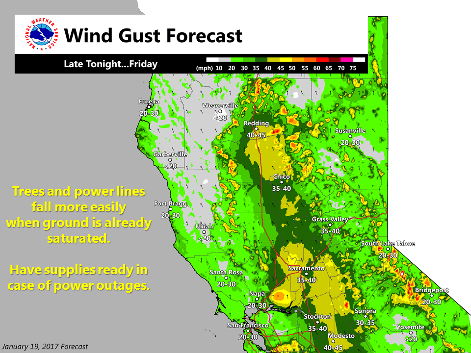 January 30, 2017 at 7:17 AM Winter storm with gusty winds late Wednesday through Friday. A storm system mid to late-week will bring rain and mountain snow to northern California. Light precipitation will start Wednesday night and become more widespread across the area Thursday. Heavier precipitation amounts are expected Thursday through Friday before tapering off by early Saturday. Storm total snow could reach up to 2 feet at pass levels, causing travel difficulties. Gusty winds are possible Thursday, which could bring down tree branches and cause localized power outages.