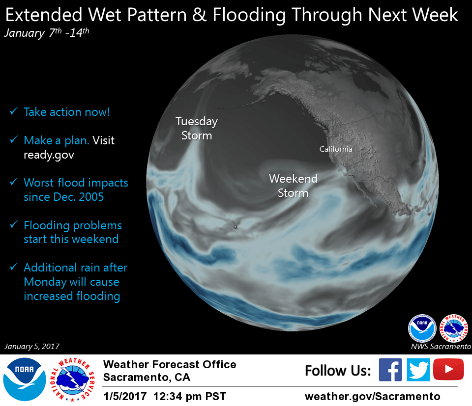 January 5, 2017 at 1:45 PM The National Weather Service in Sacramento has provided an updated briefing on this weekendโs atmospheric river and its forecast impact. The big news: Potentially more and sustained precip following the main event throughout the week.