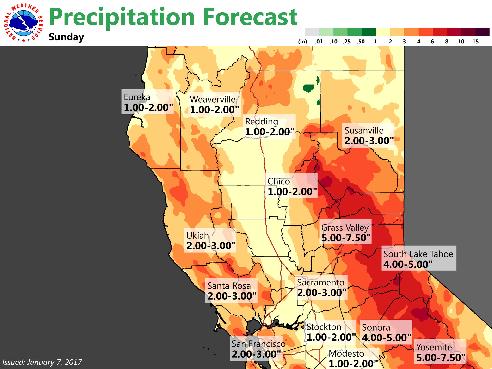 January 2, 2017 at 2:44 PM Flood watch in effect from Tuesday evening through Wednesday night. A total 4 to 7 inches of rain is expected through early Thursday with the heaviest totals over the western slopes of the Sierra Nevada Tuesday evening through Wednesday night.