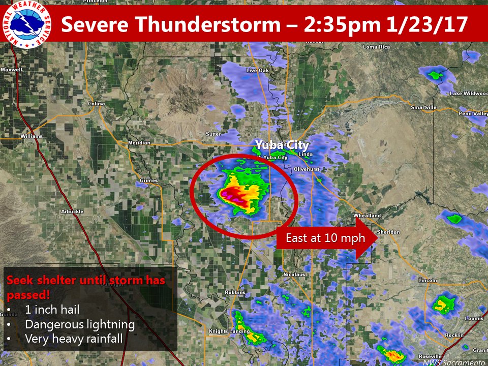 January 22, 2017 at 2:28 PM NWS Sacramento: At 2:24 PM PST, Doppler radar was tracking a strong thunderstorm near Sheridan, or 11 miles northwest of Rocklin, moving northeast at 40 mph.