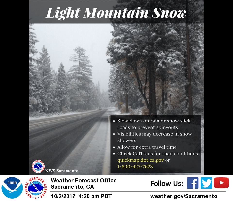 October 3, 2017 – Cooler weather with breezy north winds early this week. Lighter winds late in the week with warming temperatures. Slight chance for showers along the northern Sierra crest into this evening.