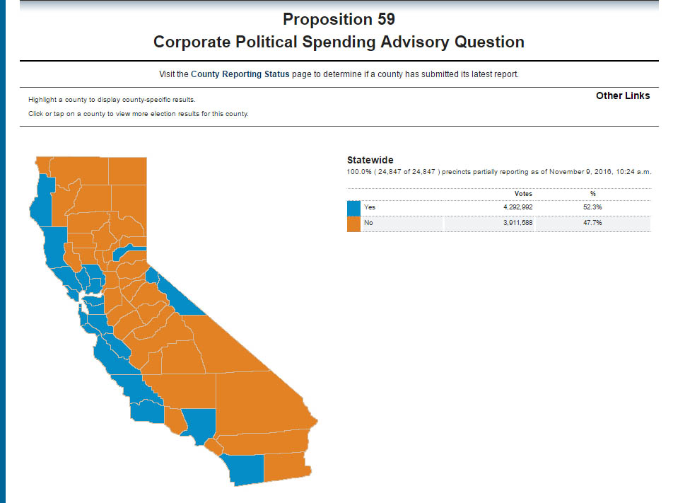Proposition 59, the Corporate Political Spending Advisory Question better known as Repeal Citizens United, Passed in Nevada County by 53.3%. Statewide, 52.3% of voters agree. It is noteworthy that Nevada County joins the coastal counties in approving this proposition while it failed in surrounding Sierra Nevada, Northstate and Inland Empire counties, with the exception of Alpine and Mono.