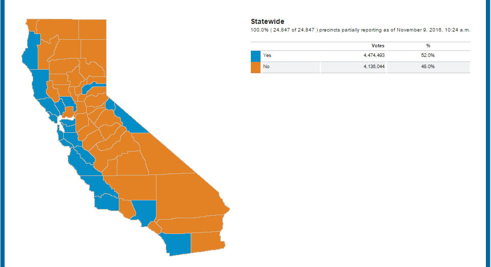 Proposition 64, Marijuana Legalization, passed in Nevada County – despite the efforts of the local Cannabis Coalition. 52.1% of Nevada County voters approve of the recreational use of marijuana, joined by 56% of voters statewide. Placer, Yuba and El Dorado counties voted No, while Sierra, Plumas and Butte Counties voted Yes.