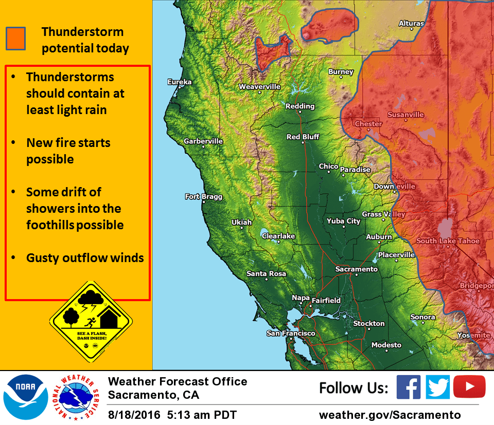 August 18, 2016 – Warm and mainly dry weather continues. Isolated Sierra thunderstorms through early next week.