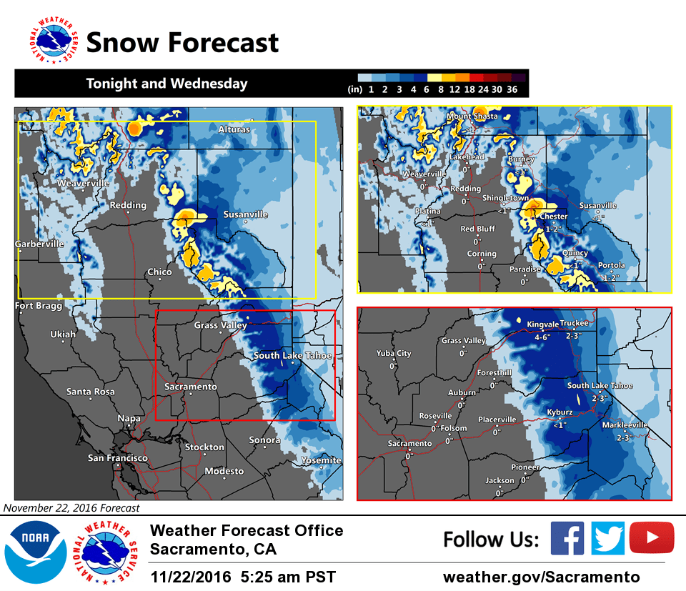 November 22, 2016 – Areas of valley fog this morning. The next storm moves into NorCal tonight into midday Wednesday followed by another arriving late Thanksgiving into Friday. Winter Weather Advisory from 6 PM this evening to noon PST Wednesday for West Slope Northern Sierra Nevada-Western Plumas County/Lassen Park.