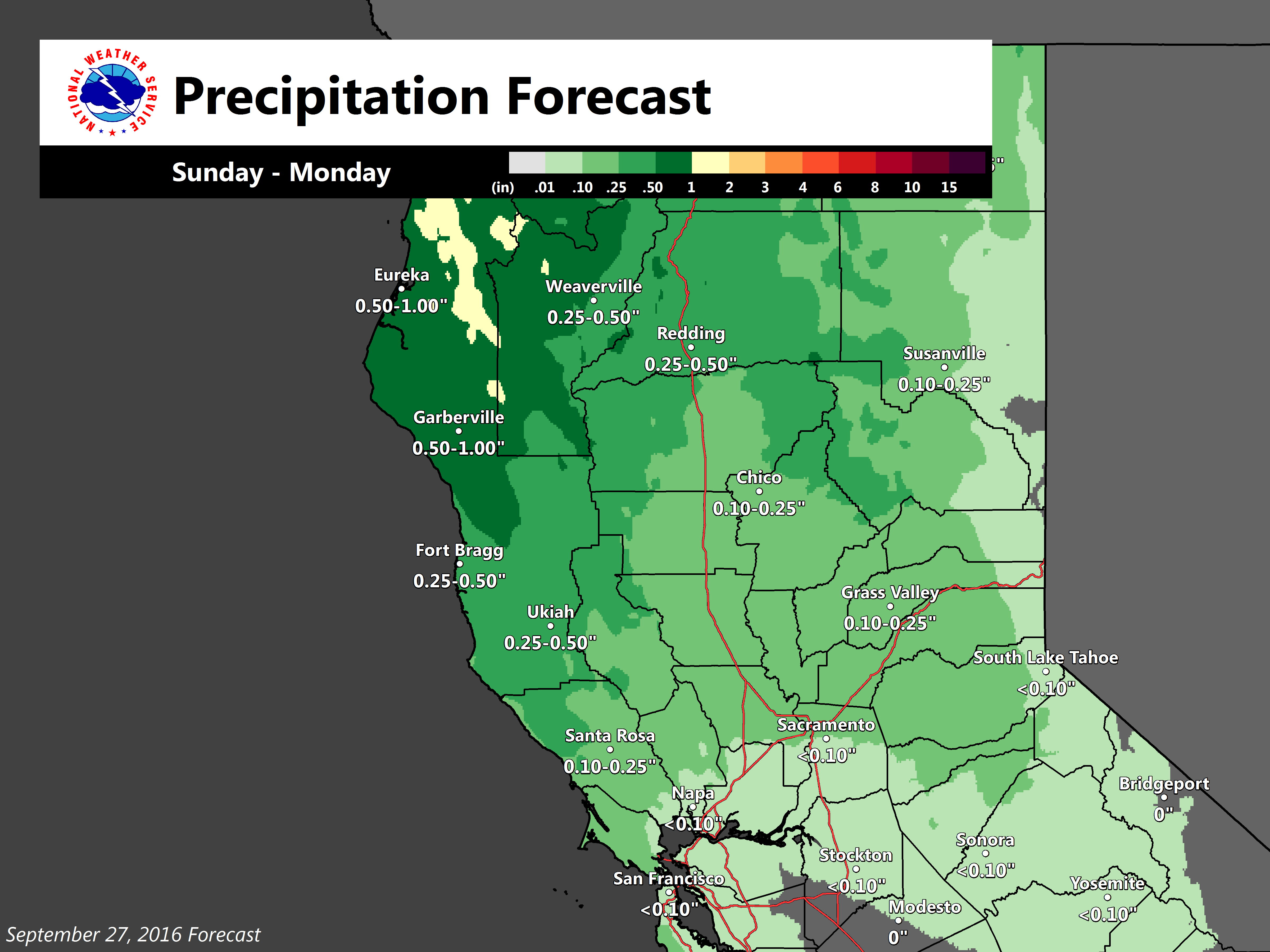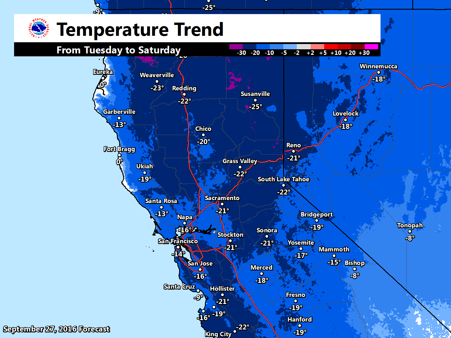 September 28, 2016 – Cool down begins today with much cooler temperatures by the end of the week as a weather system moves toward NorCal. Chance of precipitation early next week.