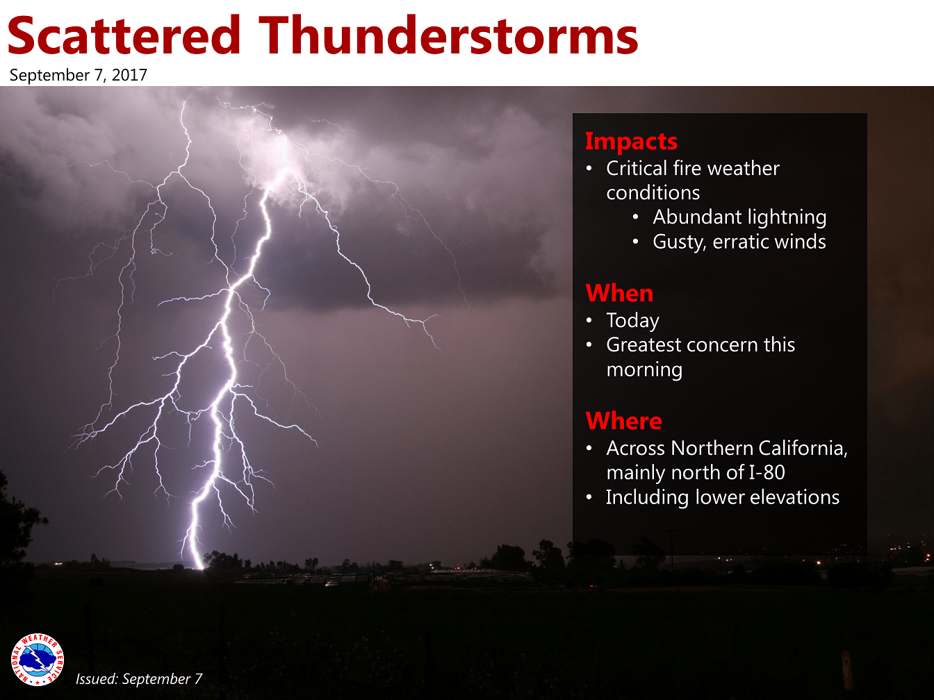 Thunderstorm development began around 3 am this morning, primarily in Tehama and Glenn counties. The lines of thunderstorms are moving northwest and extend from the I-5 corridor towards the coastal range. Brief heavy downpours, small hail, gusty winds, and lightning are all possible with these storms. If you hear thunder, stay sheltered.