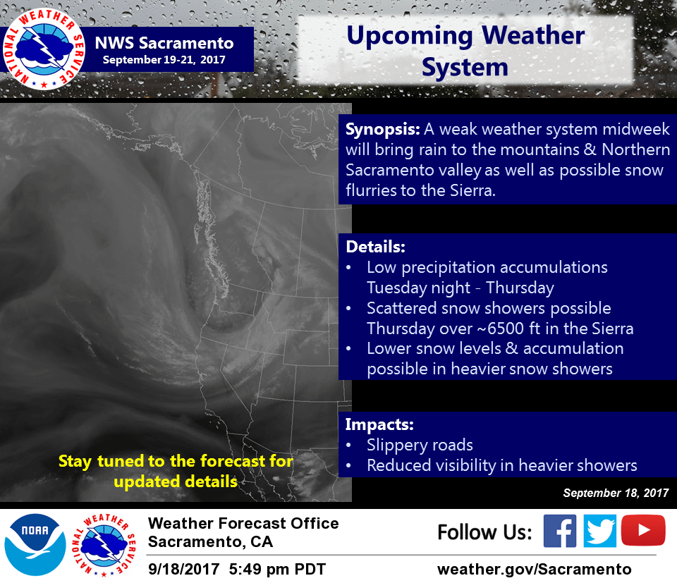 September 19, 2017 – The upcoming weather system will bring low precipitation amounts to the mountains & Northern Sacramento Valley and light snow showers to the Sierra crest.