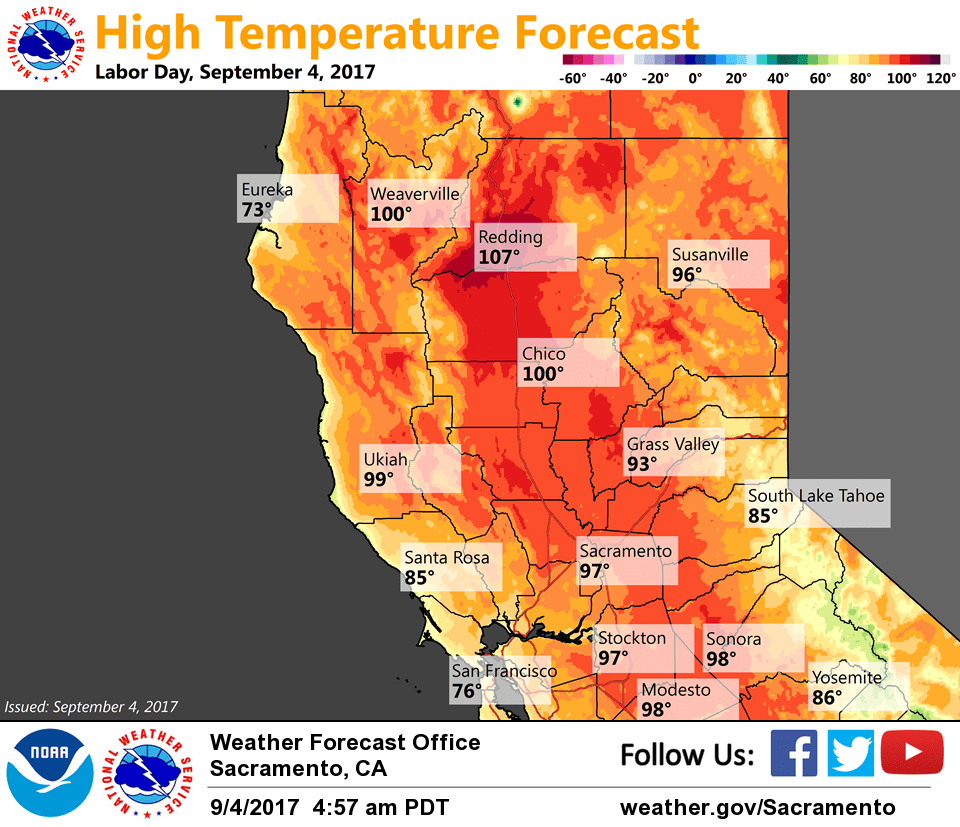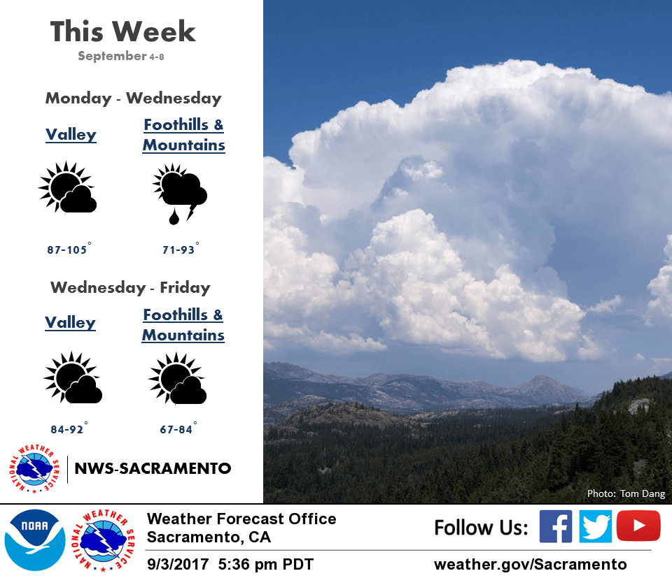 September 4, 2017 – Downward trend in temperatures starts today with near seasonal temperatures by Wednesday. Showers and thunderstorms possible through Wednesday, mainly over the mountains.