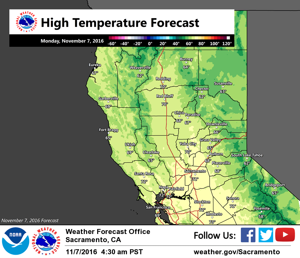 November 7, 2016 – Dry and mild through Thursday, then cooler with a threat of some precipitation towards the end of the week.