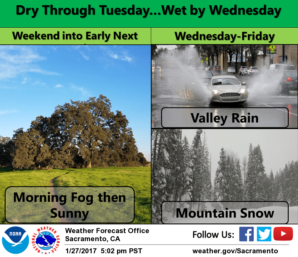 January 28, 2017 – Dry next several days with patchy morning valley fog. Wet pattern returns with light precipitation Wednesday with heavier rain and mountain snow Thursday and Friday.