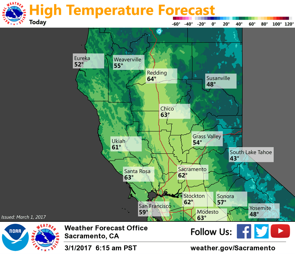 March 1, 2017 – Flooding concerns continue as runoff from recent rain continues to work its way downstream adding stress to waterways. Dry weather with warming trend through the end of the week. Wet pattern returns this weekend into next week.