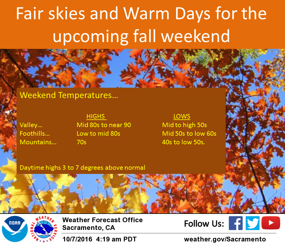 October 7, 2016 – Dry weather with warm temperatures continuing through the weekend. A cooling trend next week with a chance of precipitation spreading over northern California by mid week.