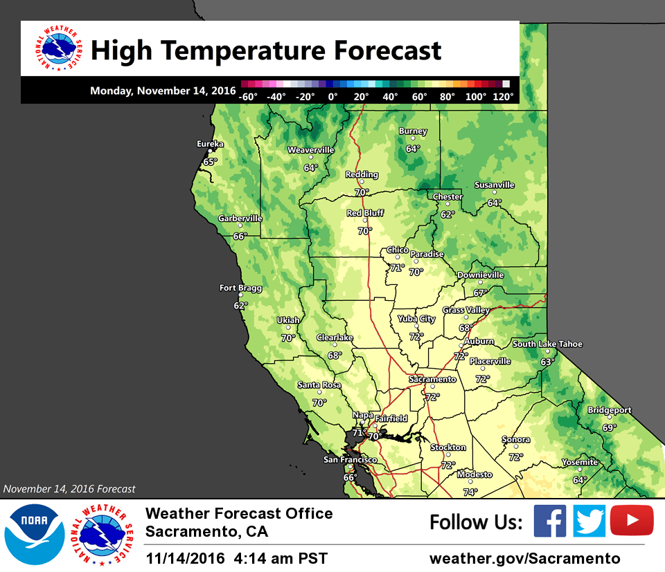 November 14, 2016 – Dry weather through early Tuesday and patchy morning valley fog. A system will bring light rain and mountain snow to the area later Tuesday into Wednesday. Mainly dry Thursday-Friday. Wet weather may develop next weekend.