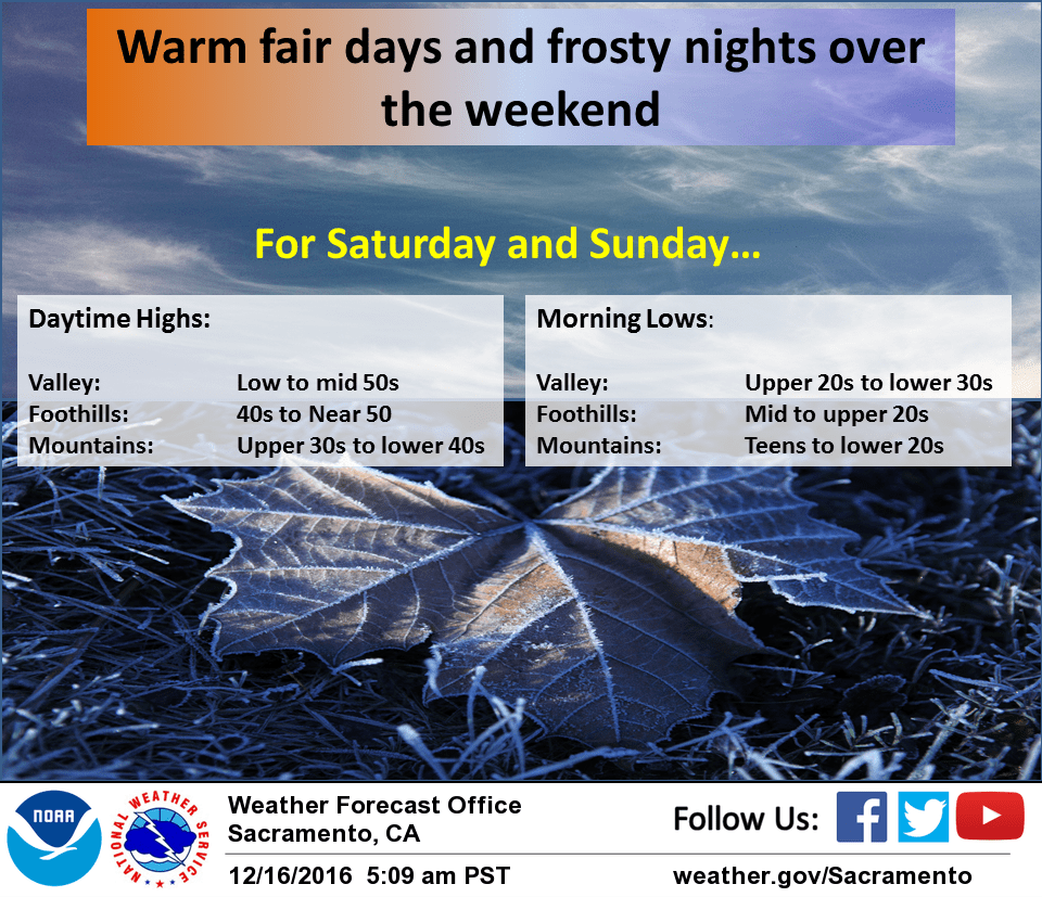December 16, 2016 – Showers ending over the Sierra today with only light additional snow accumulations. Freezing temperatures in the valley this weekend with dry conditions. Mainly dry next week except for a chance of light showers during mid week. A better chance of rain most areas by next Friday.