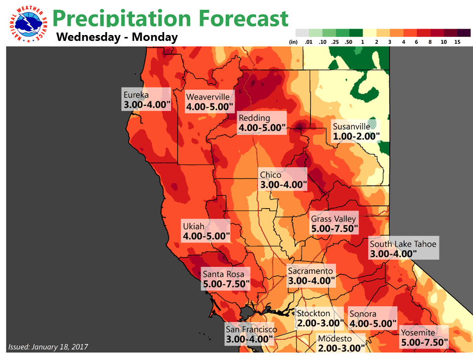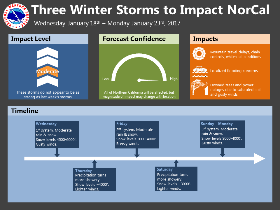 January 18, 2017 – First in series of winter storms moves through today with another Friday and a third around Sunday. Higher elevation travel impacts are likely due to snow and winds today and Thursday with lower snow levels for the Friday and Sunday storms. Moderate to heavy rain at the lower elevations with windy conditions today through this evening and again on Sunday.