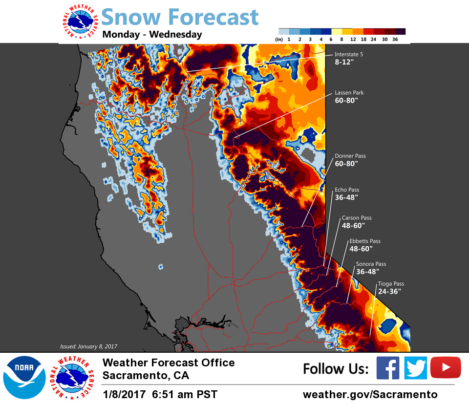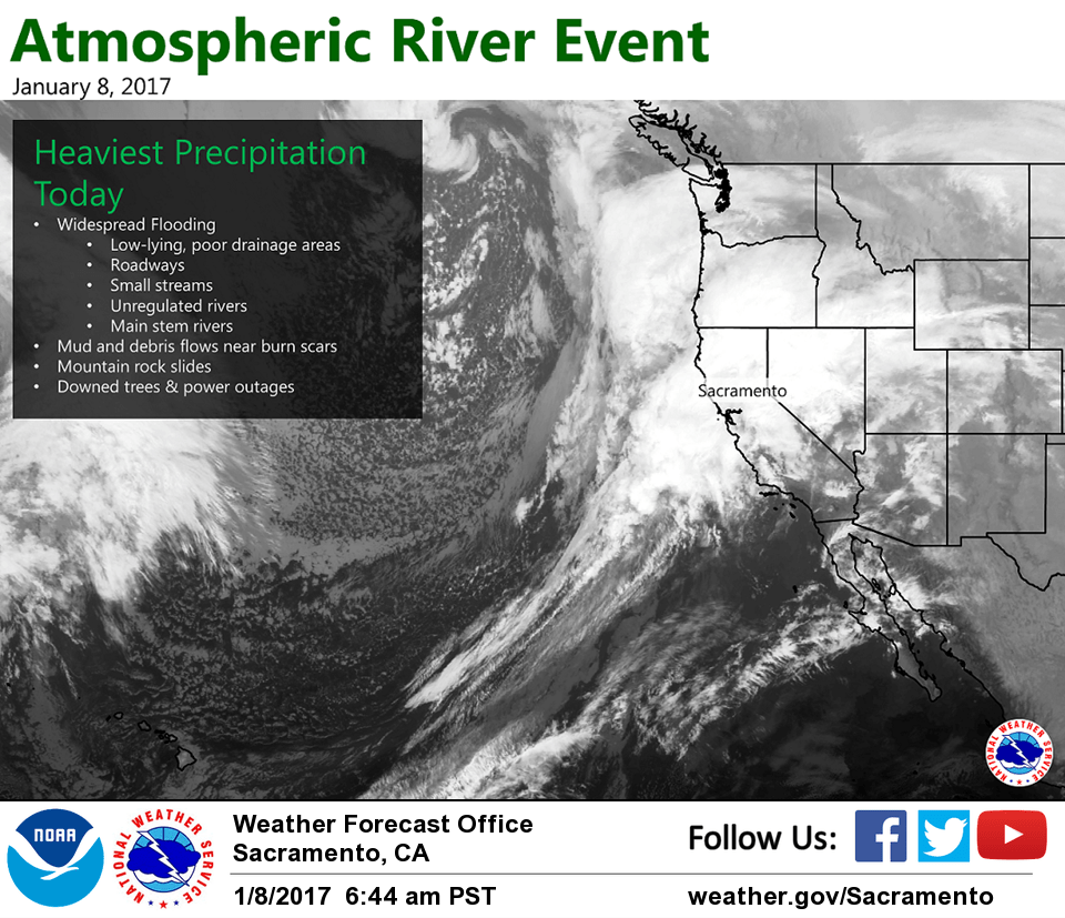 January 8, 2017 – Heavy rain, gusty winds, and flooding concerns today. Flooding concerns continue Monday into Wednesday with very heavy mountain snow expected. Another weather system possible Thursday.