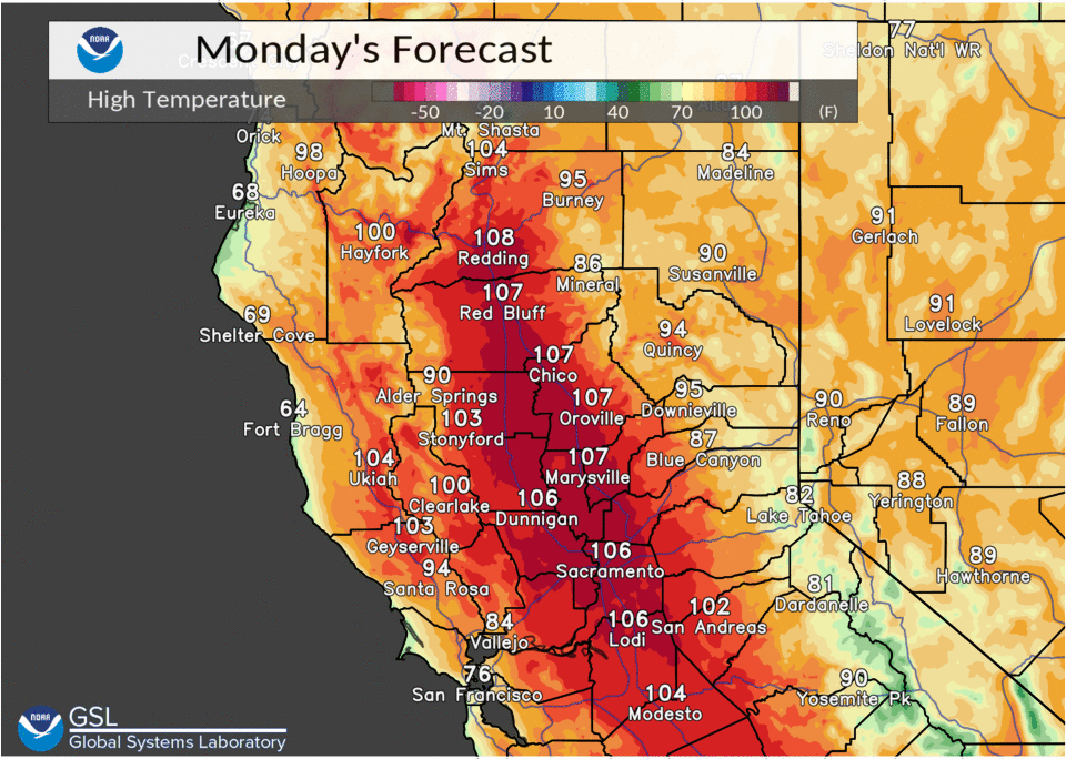 Highs will range from 20 to 25 degrees above climatology for this time of year. Maximum temperatures are expected to soar to around 106 in the Sacramento Metro area and upwards of 108 to 109 in the Northern Sacramento Valley.