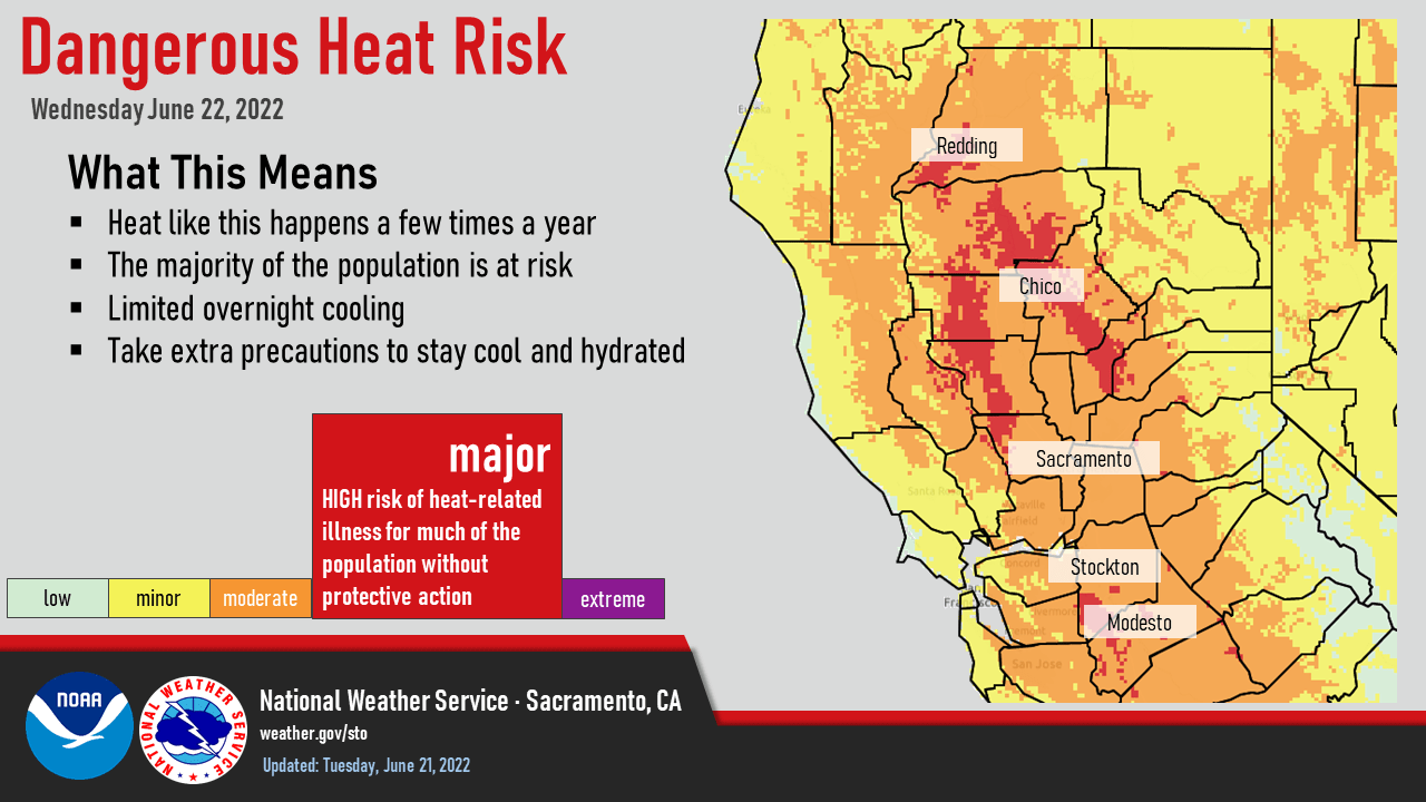Hot weather expected the next several days as the low drifts south off the central California coast. Widespread moderate, to locally high, heat risk is expected across the valley and foothills. Offshore (north to east) winds will peak this morning, then subside this afternoon as surface pressure gradient relaxes.