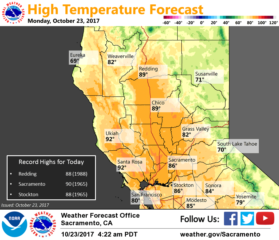 Record or near record warm temperatures will be possible across the Central Valley the next few days as highs top out in the mid 80s to lower 90s (around 15 degrees above average for late October). Some minor cooling will be possible after mid-week as the ridge retrogrades slightly in response to a system moving through the PacNW into the Rockies.
