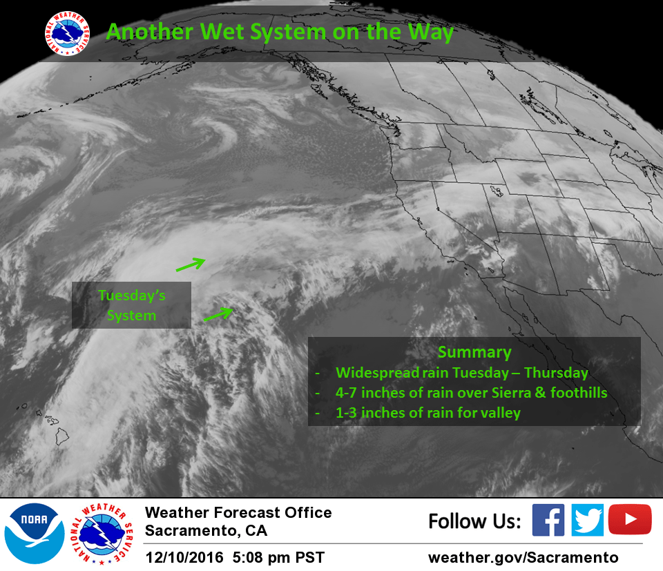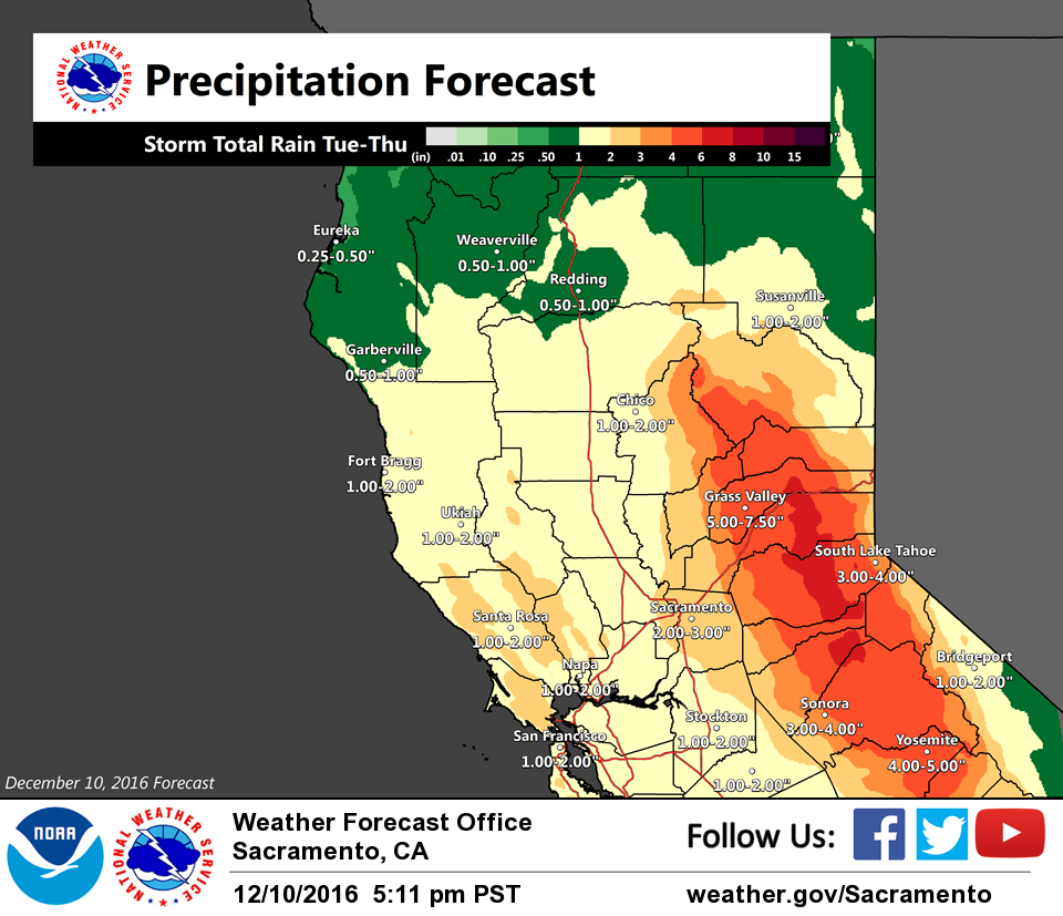 December 11, 2016 – Dry Sunday and Monday followed by potentially significant rain and mountain snow Tuesday through Thursday. Winter Storm Watch from Tuesday morning through Wednesday afternoon for West Slope Northern Sierra Nevada.