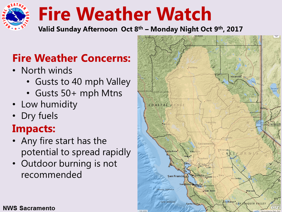 October 5, 2017 at 11:17 AM Strong and gusty north winds will bring critical fire weather conditions to much of interior Northern California Sunday and Monday.