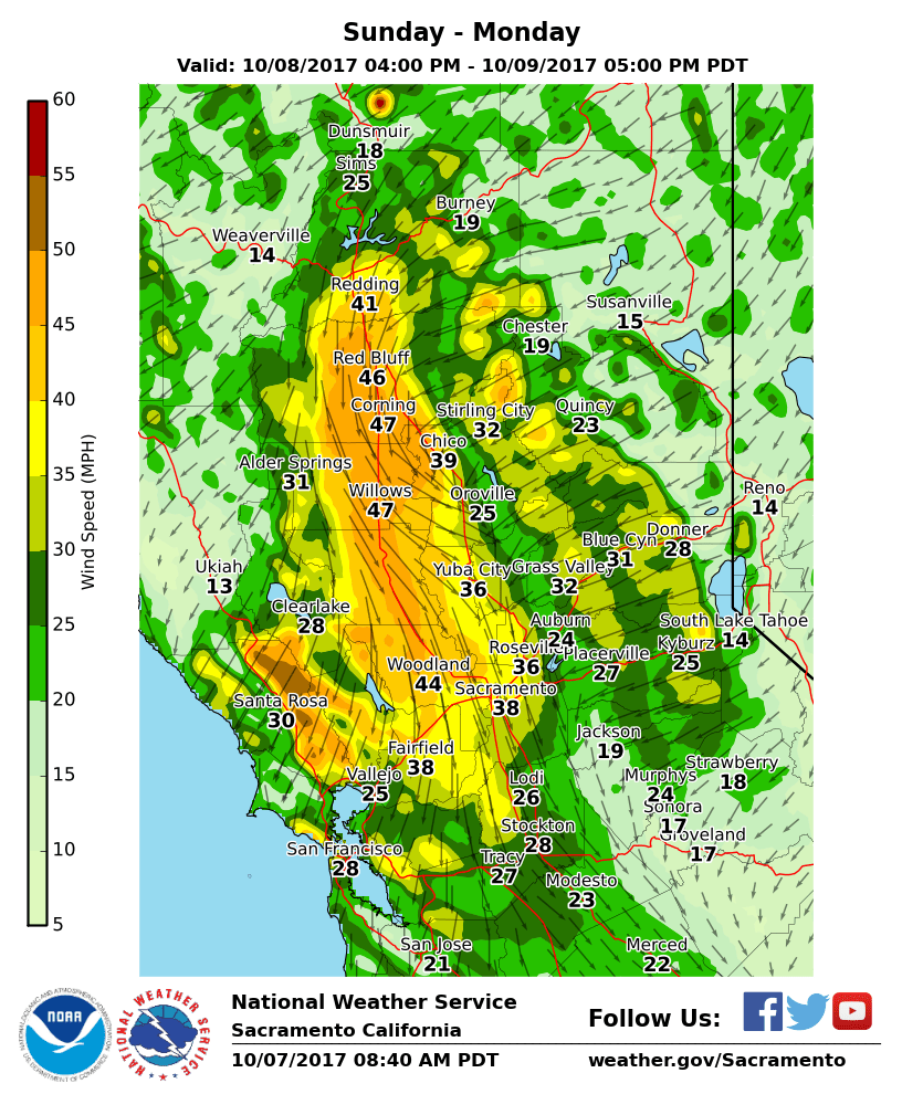 October 7, 2017 at 12:58 PM The National Weather Service in Sacramento has issued a Wind Advisory, which is in effect from 8 PM Sunday to 9 AM PDT Monday. Winds increase Sunday evening with strongest wind occurring in the overnight hours into early Monday morning. Northeast wind 20 to 40 mph with local gusts up to 55 mph. A Wind Advisory means that sustained winds of 25 to 39 mph or gusts 40 to 57 mph are possible. Winds this strong can cause blowing debris and make driving difficult, especially for high profile vehicles. Secure lose objects that could be damaged by the wind, and use extra caution driving.