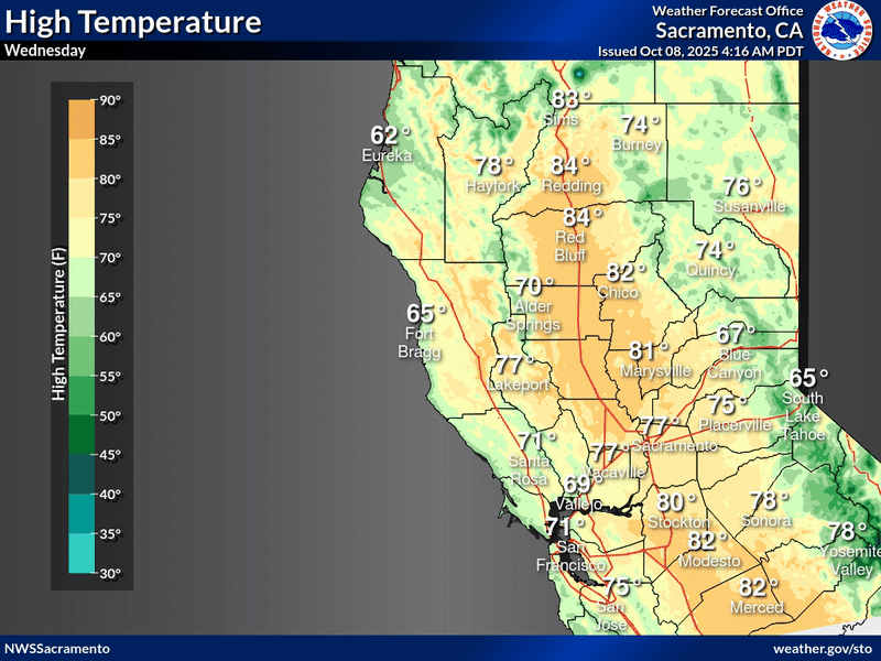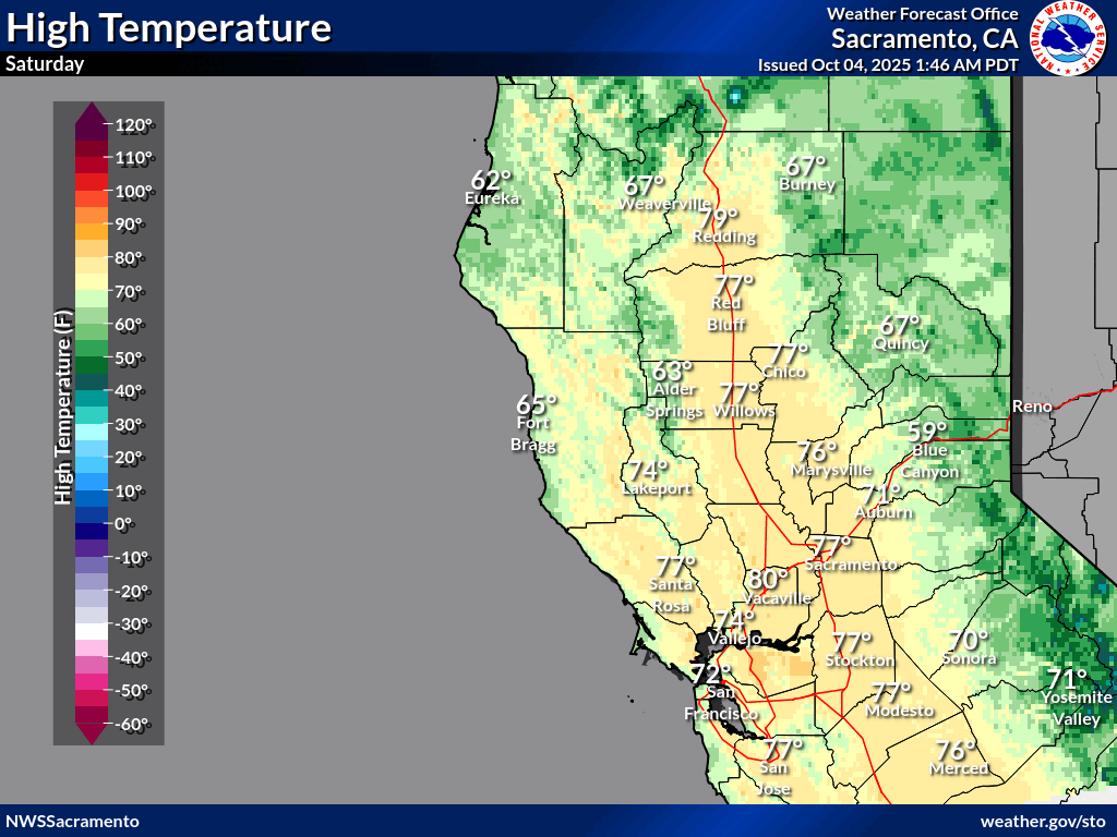 October 5, 2025 at 7:15 AM NWS update: Periods of breezy north to east winds today and tomorrow in the northern Sacramento Valley along and west of the I-5 corridor. Seasonable high temperatures remain in the forecast for the week ahead.