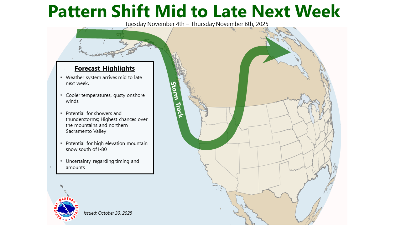 October 30, 2025 at 6:58 AM NWS update: Dry weather and light to breezy winds will continue through Halloween weekend, with warm temperatures. Chances for active weather return mid to late next week. A relatively warm system will reintroduce precipitation chances along with gusty onshore winds and cooler weather. Details on timing and amounts are still uncertain at this time.