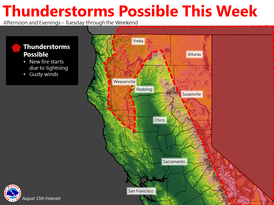 August 15, 2016 – Beginning Tuesday afternoon and lasting through the weekend, thunderstorms elevate the potential for new fire starts in northern California. The National Weather Service in Sacramento released an updated forecast, confirmed by NorthOps’ seven day fire weather narrative.