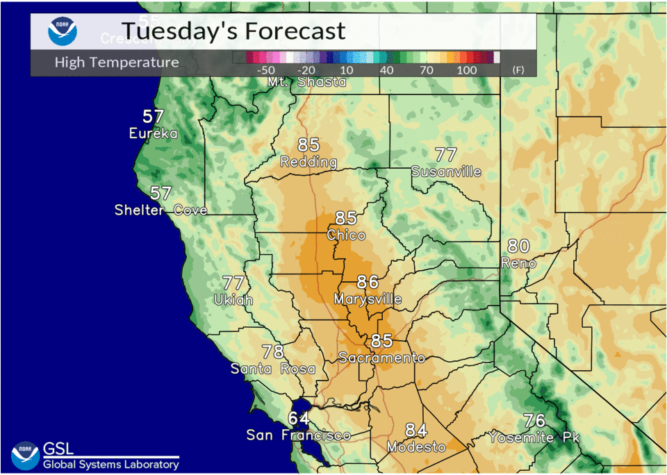 Dry weather with mild temperatures expected today as the onshore flow decreases. The low that brought the unsettled weather to NorCal over the weekend is now over Colorado and New Mexico, so its remaining influence has waned and we’re not expecting any mountain showers or thunderstorms today. The Delta, southern Sacramento Valley and northern San Joaquin Valley will see warmer temperatures today, but readings will be similar to Monday’s across much of the remainder of interior NorCal.
