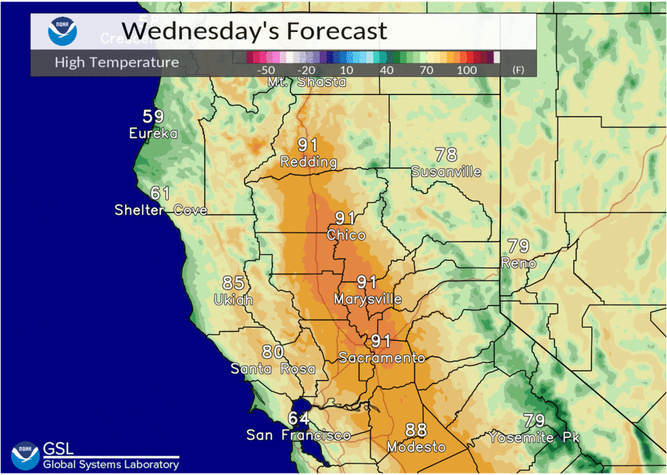 Slightly warmer temperatures are expected today as highs climb into the lower 90s across the Central Valley. Another minor cool down is expected Thursday as a trough passes to the north through the PacNW.