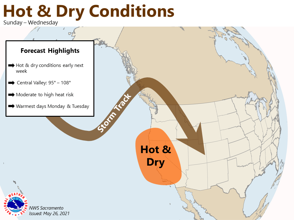 May 26, 2021 – Dry weather with temperatures near or above average through the week. Hot conditions will develop early next week.