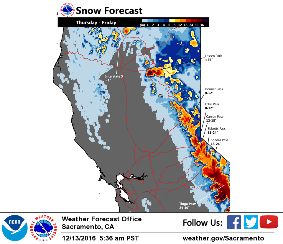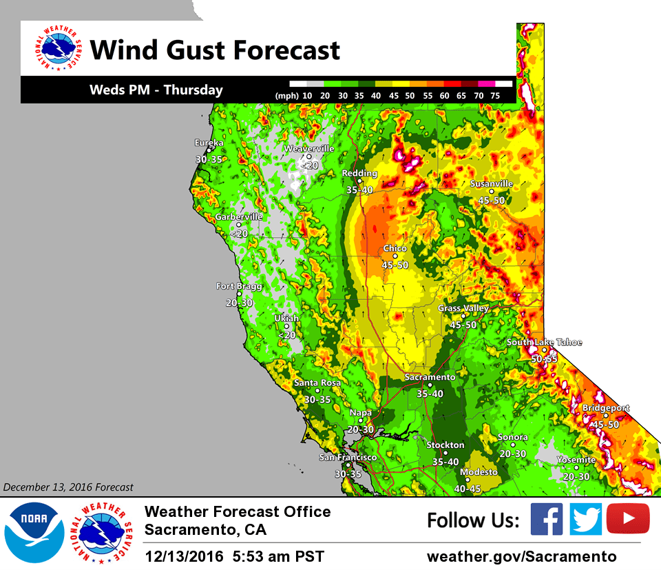 December 13, 2016 – Wet weather returns to NorCal today with significant rainfall and mountain snow likely by Wednesday into Friday. Flood Watch from noon today through late Thursday night. Wind Advisory from noon Wednesday to noon Thursday. Winter Storm Watch from Thursday afternoon through Friday afternoon for West Slope Northern Sierra Nevada.