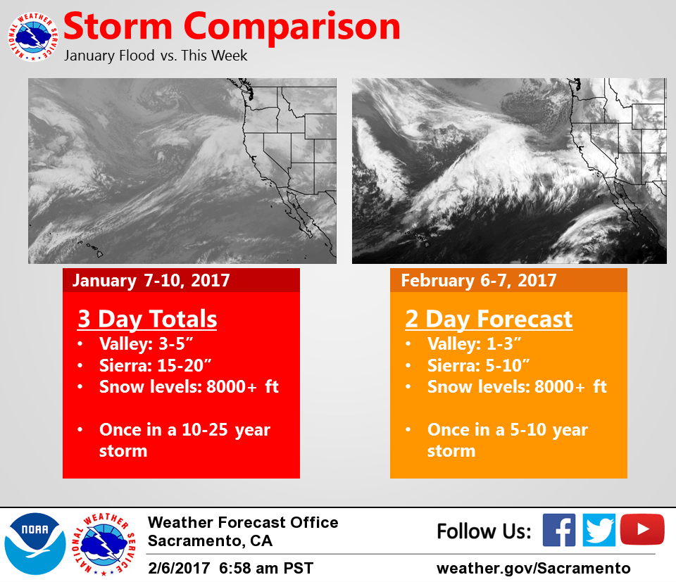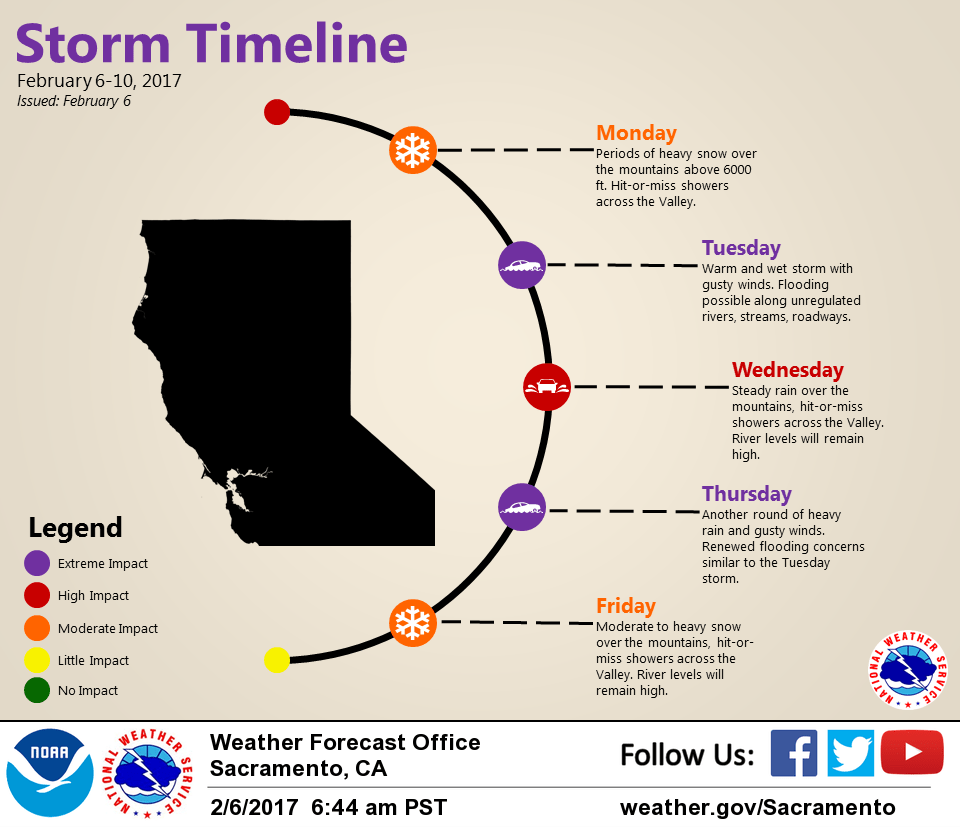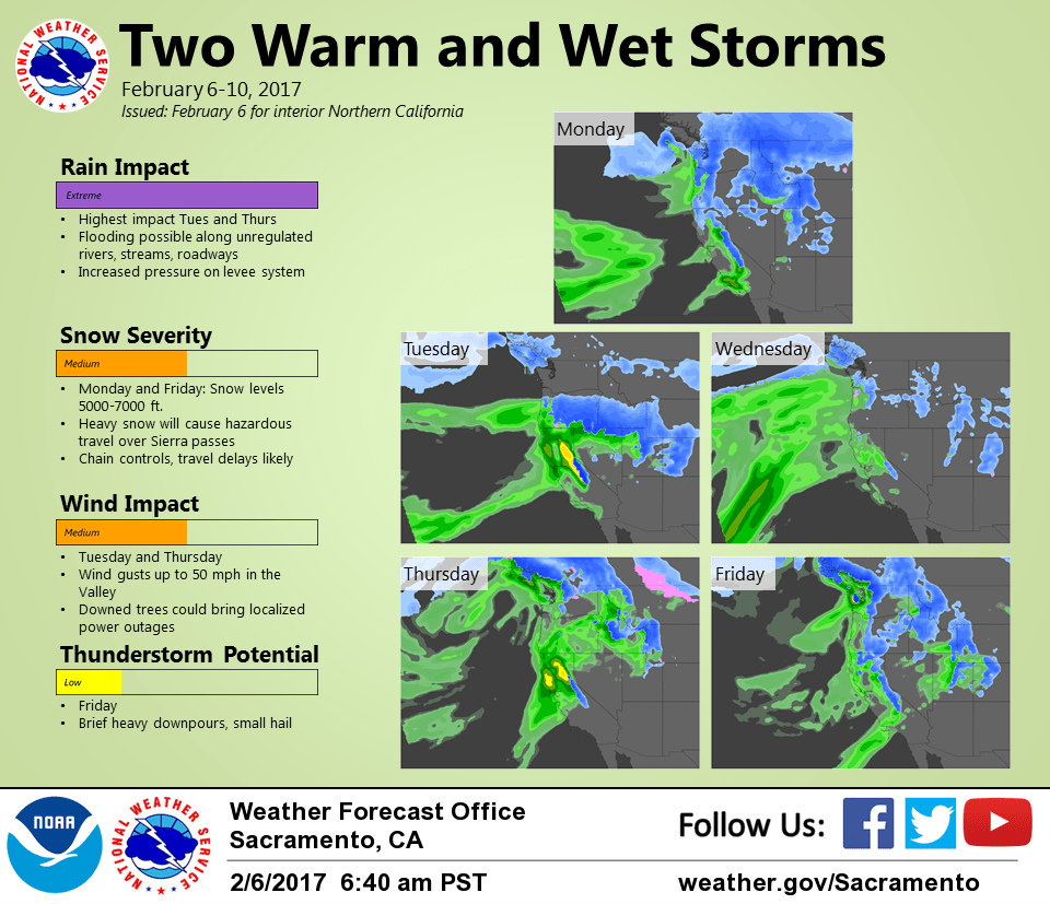 February 6, 2017 – Series of Pacific storms will bring periods of moderate to heavy rain and mountain snow with strong wind to Interior Northern California this week.