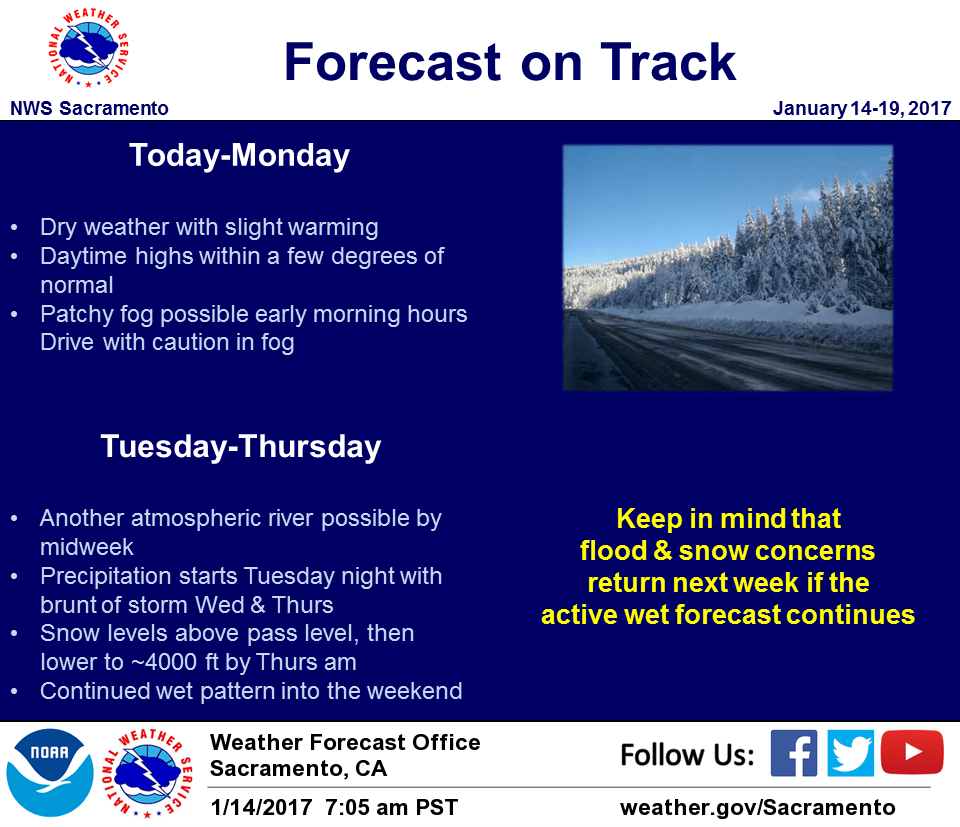 January 14, 2017 – Fairly dry conditions through Monday. Heavy precipitation is possible by midweek with renewed flooding concerns as the wet pattern could extend into the weekend.