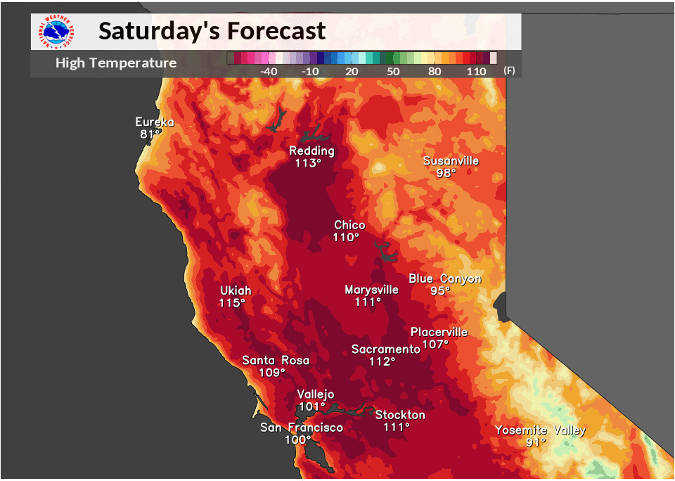 Hot weather peaks today with a strong high pressure ridge over the West. While the calendar shows that meteorological summer is over, this could be the hottest day of the year for some locations, with a forecast high at Redding of 113, 112 at Sacramento, 113 for Fairfield, and 110 for Stockton. An Excessive Heat Warning continues into Monday evening. Somewhat less hot weather is expected Sunday and Labor Day, especially for Delta breeze influenced areas.