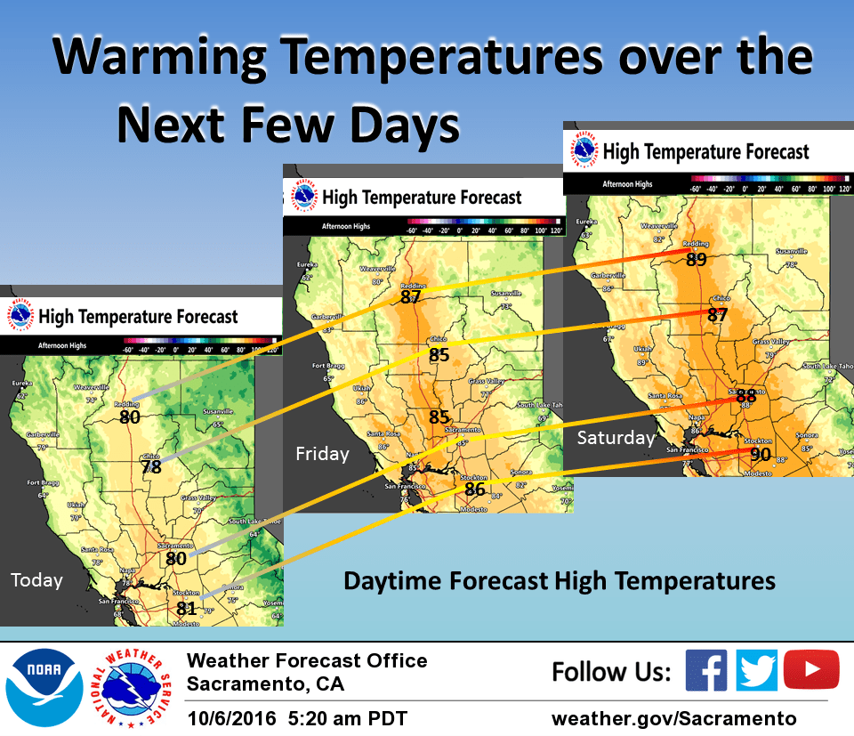 October 6, 2016 – Dry weather with a gradual warming trend the rest of the week then a cooling trend next week. A chance of precipitation northern regions by mid week. Breezy north winds today then lighter north winds through the end of the week.
