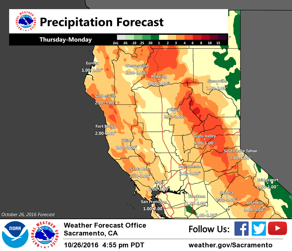 Heavier rain expected to arrive tonight into midday Friday as the wave currently to the southwest of 30N/130W approaches bringing stronger lift to the very moist airmass (some of it originating from Hurricane Seymour). Amounts in excess of an inch will be possible across the northern San Joaquin Valley and southern half of the Sacramento Valley by midday Friday while portions of the northern Sierra may see 2-4 inches. Snow levels will be very high with no impact to travel expected.