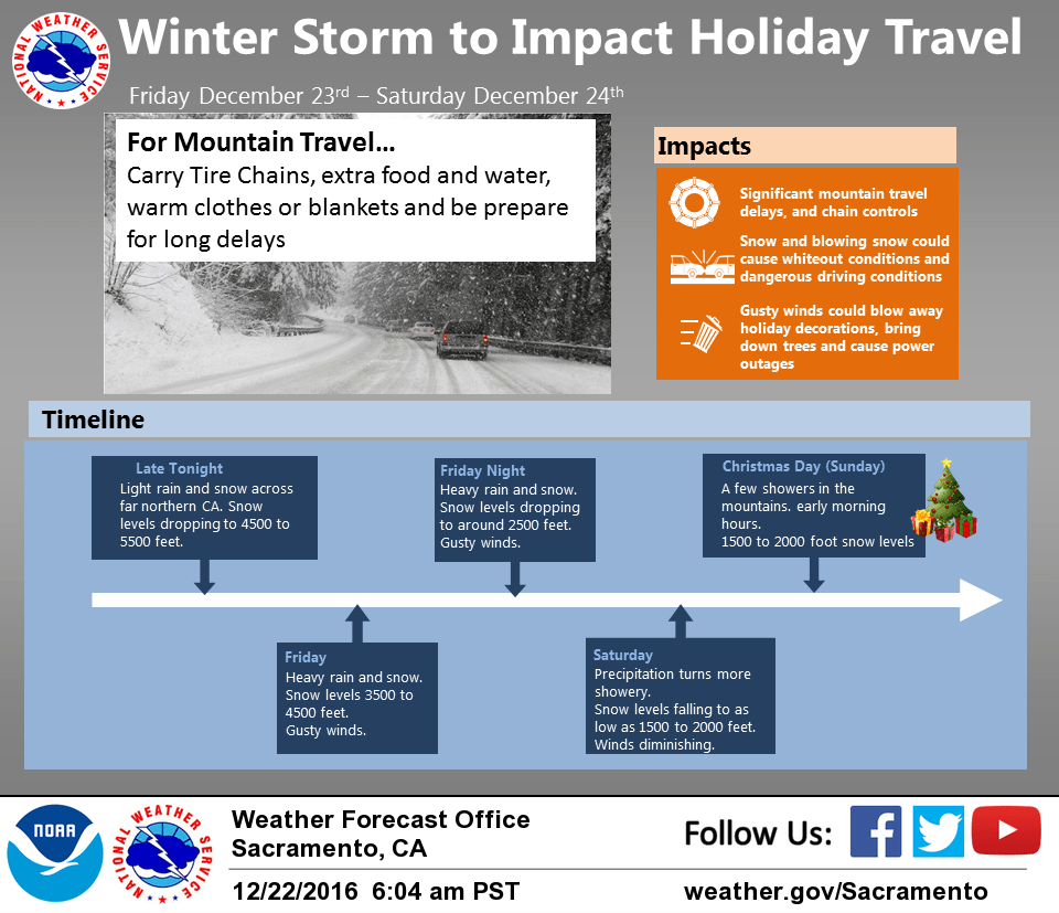 December 22, 2016 – Cool and dry weather today. A winter storm with rain, wind and heavy mountain snow is expected to start to move into the area by Friday disrupting holiday travel through Saturday. Clearing Sunday. A chance of showers northern mountains early next week, otherwise dry.