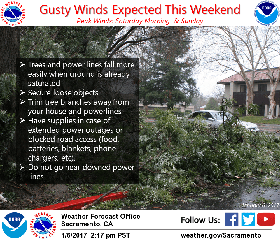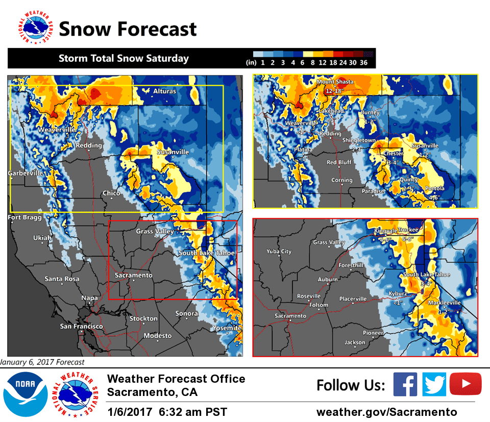January 6, 2017 – An atmospheric river, a narrow corridor of concentrated moisture, will impact interior Northern California over the weekend. Snow begins early Saturday morning becoming moderate to heavy at times. Snow levels will initially be into the Foothills but rise during the day, climbing above pass levels Saturday afternoon into night. Snow remains above pass levels Sunday when the heaviest precipitation is forecast.